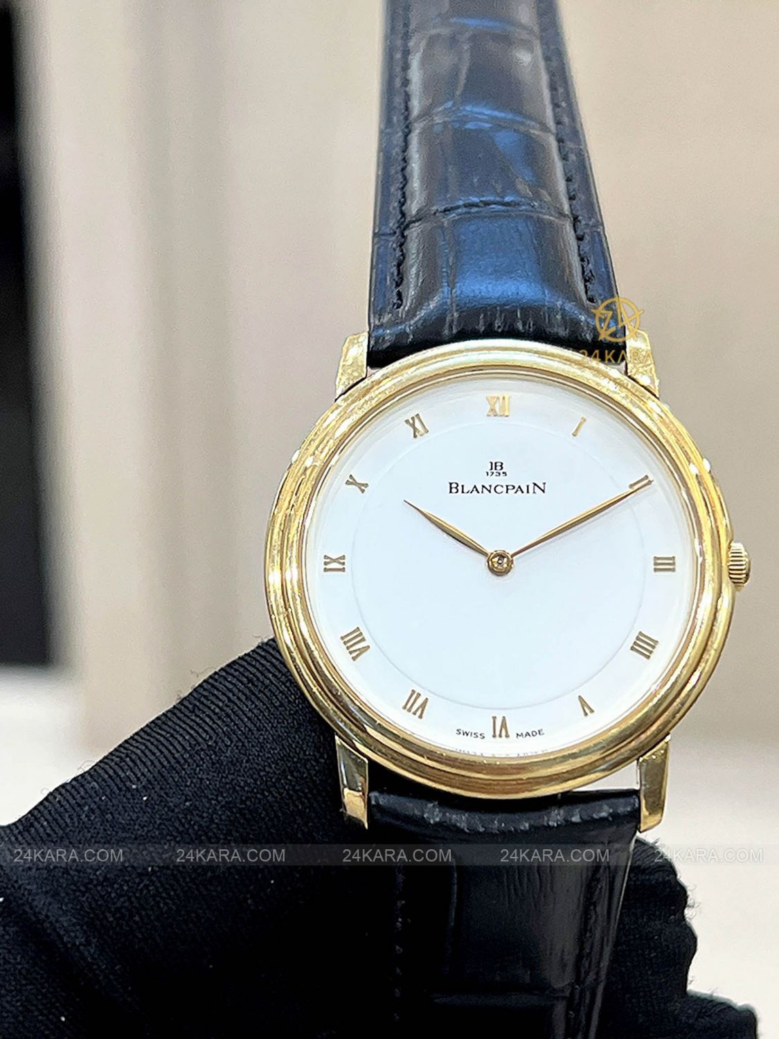 Không chi tiết dư thừa, không họa tiết phức tạp - chỉ có sự thuần khiết tuyệt đối. Các cọc số La Mã thanh mảnh bằng vàng được đặt cân đối quanh vòng chapter ring mảnh, tạo điểm nhấn cổ điển mà không phô trương. Logo Blancpain và mốc năm 1735 xuất hiện khiêm nhường nhưng đầy uy lực - lời nhắc rằng đây là thương hiệu đồng hồ lâu đời nhất thế giới.
